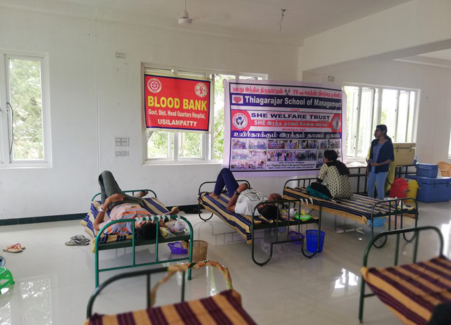 Our SHE WELFARE TRUST conducted a Blood Donation Camp On 18/08/2018in MADURAI THIAGARAJARSCHOOL OF MANAGEMENT. Nearly 63 college students participated in this camp and donated the blood.Govt.Hospital,Usilampatticollected the blood and utilized for emergency cases.